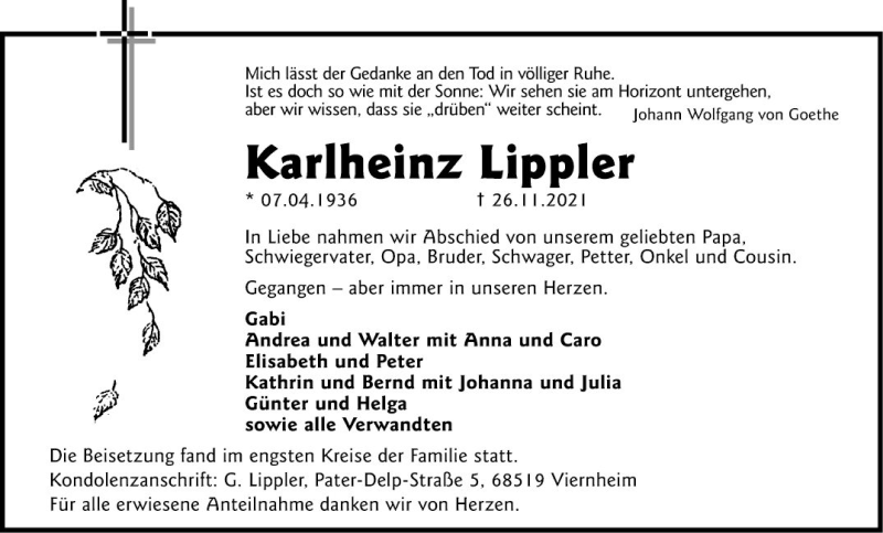 Hier finden Sie alle Traueranzeigen aus der Zeitung, die bisher für Karlheinz Lippler erschienen sind. Weitere Traueranzeigen, die in der Zeitung erscheinen, werden hier ebenfalls aufgelistet
