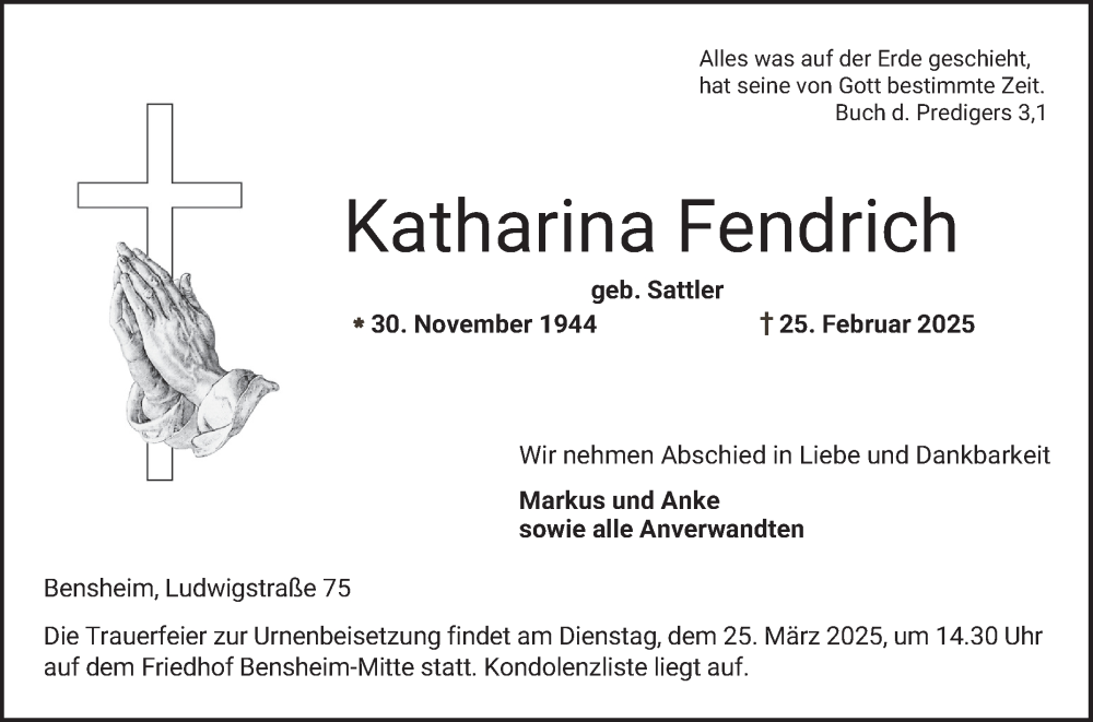 Hier finden Sie alle Traueranzeigen aus der Zeitung, die bisher für Katharina Fendrich erschienen sind. Weitere Traueranzeigen, die in der Zeitung erscheinen, werden hier ebenfalls aufgelistet