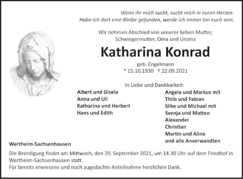 Hier finden Sie alle Traueranzeigen aus der Zeitung, die bisher für Katharina Konrad erschienen sind. Weitere Traueranzeigen, die in der Zeitung erscheinen, werden hier ebenfalls aufgelistet