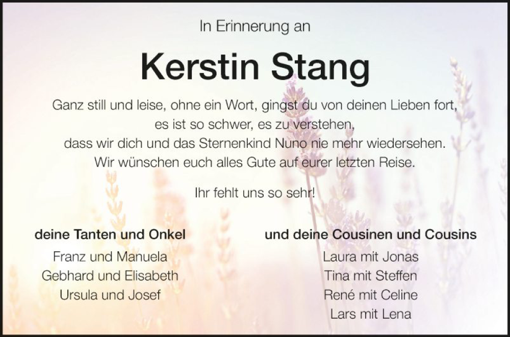 Hier finden Sie alle Traueranzeigen aus der Zeitung, die bisher für Kerstin Stang erschienen sind. Weitere Traueranzeigen, die in der Zeitung erscheinen, werden hier ebenfalls aufgelistet