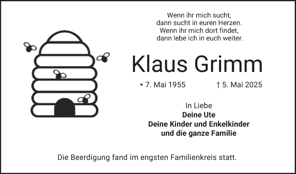 Hier finden Sie alle Traueranzeigen aus der Zeitung, die bisher für Klaus Grimm erschienen sind. Weitere Traueranzeigen, die in der Zeitung erscheinen, werden hier ebenfalls aufgelistet