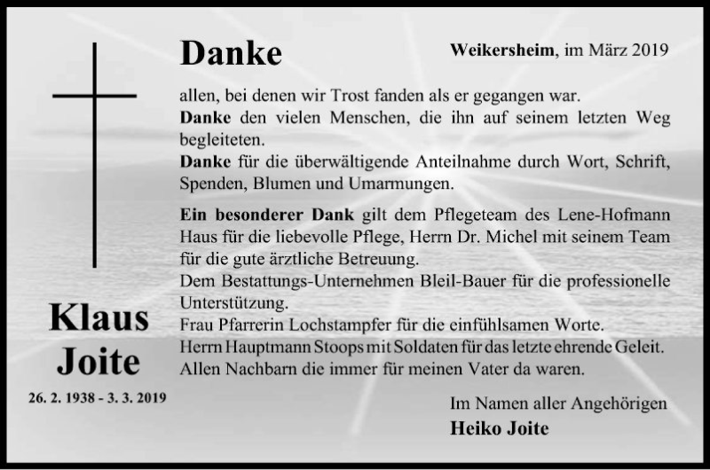 Hier finden Sie alle Traueranzeigen aus der Zeitung, die bisher für Klaus Joite erschienen sind. Weitere Traueranzeigen, die in der Zeitung erscheinen, werden hier ebenfalls aufgelistet