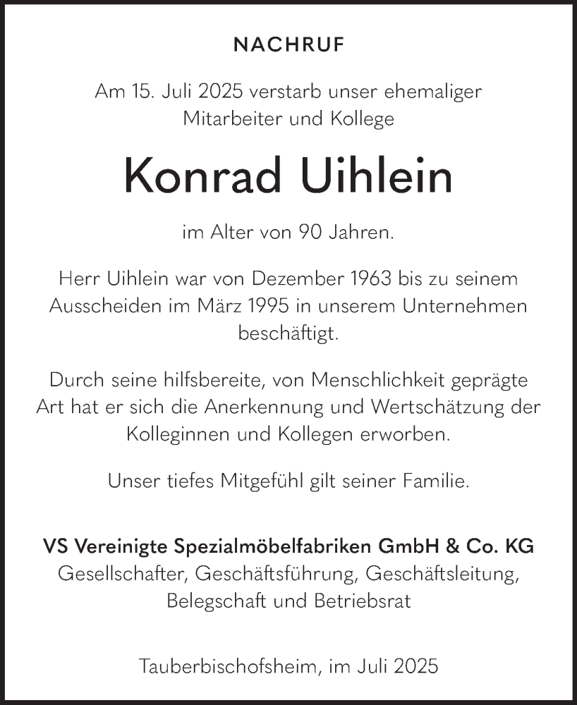 Hier finden Sie alle Traueranzeigen aus der Zeitung, die bisher für Konrad Uihlein erschienen sind. Weitere Traueranzeigen, die in der Zeitung erscheinen, werden hier ebenfalls aufgelistet