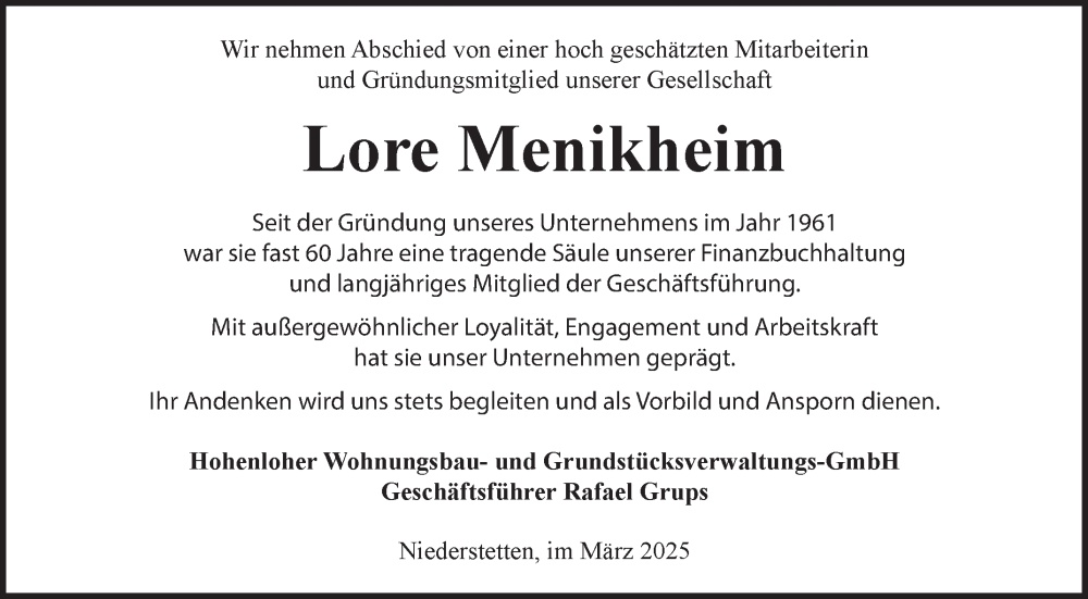 Hier finden Sie alle Traueranzeigen aus der Zeitung, die bisher für Lore Menikheim erschienen sind. Weitere Traueranzeigen, die in der Zeitung erscheinen, werden hier ebenfalls aufgelistet