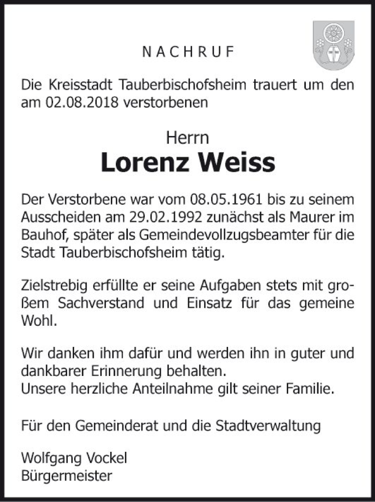 Hier finden Sie alle Traueranzeigen aus der Zeitung, die bisher für Lorenz Weiss erschienen sind. Weitere Traueranzeigen, die in der Zeitung erscheinen, werden hier ebenfalls aufgelistet