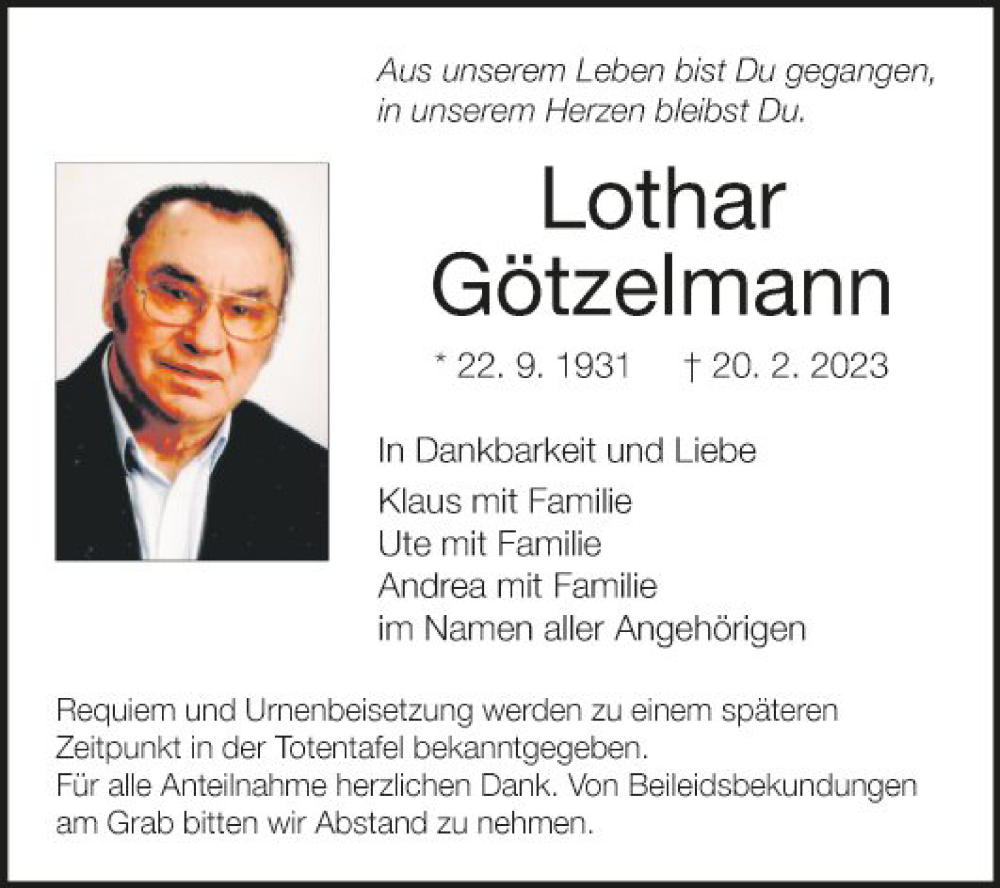 Hier finden Sie alle Traueranzeigen aus der Zeitung, die bisher für Lothar Götzelmann erschienen sind. Weitere Traueranzeigen, die in der Zeitung erscheinen, werden hier ebenfalls aufgelistet