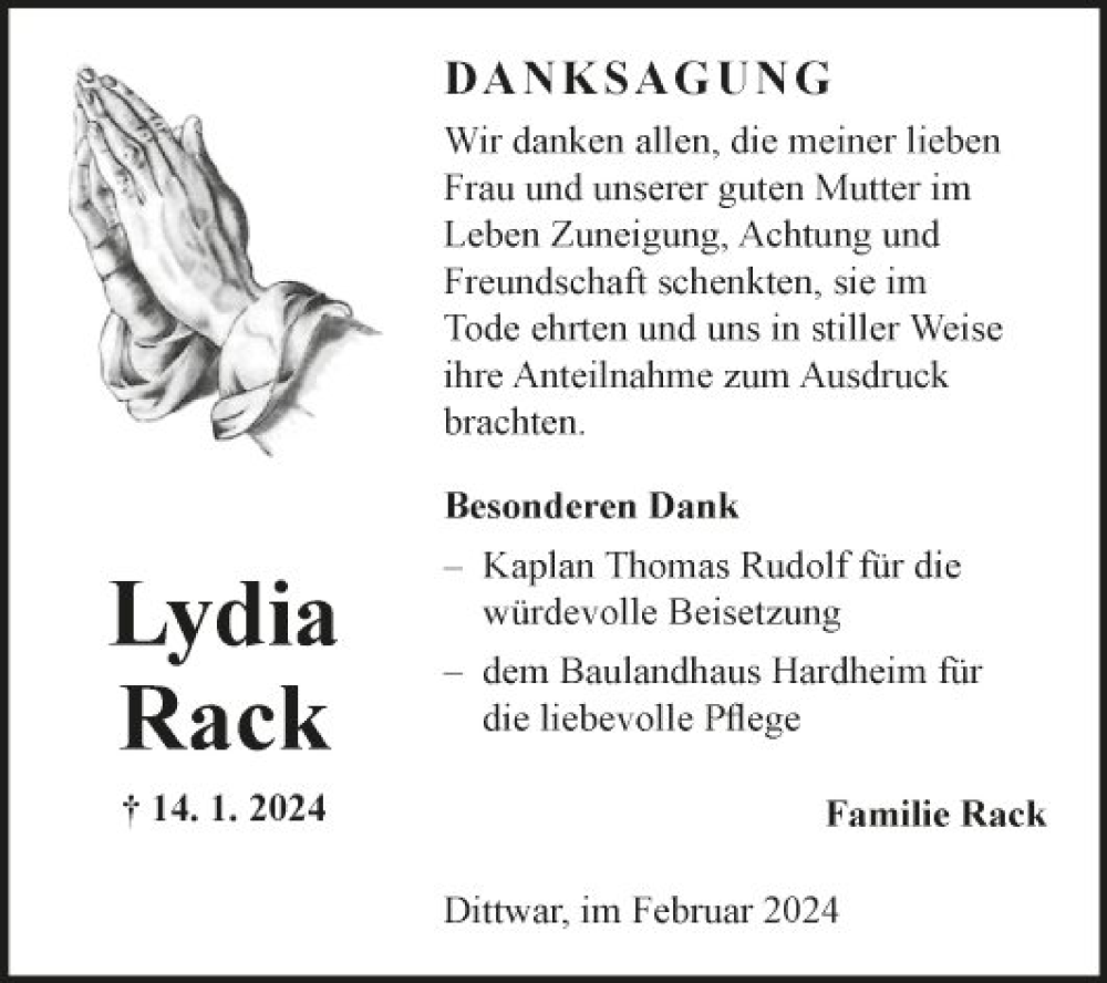 Hier finden Sie alle Traueranzeigen aus der Zeitung, die bisher für Lydia Rack erschienen sind. Weitere Traueranzeigen, die in der Zeitung erscheinen, werden hier ebenfalls aufgelistet