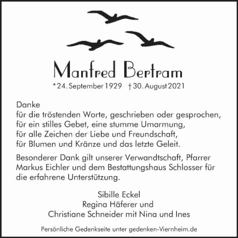 Hier finden Sie alle Traueranzeigen aus der Zeitung, die bisher für Manfred Bertram erschienen sind. Weitere Traueranzeigen, die in der Zeitung erscheinen, werden hier ebenfalls aufgelistet