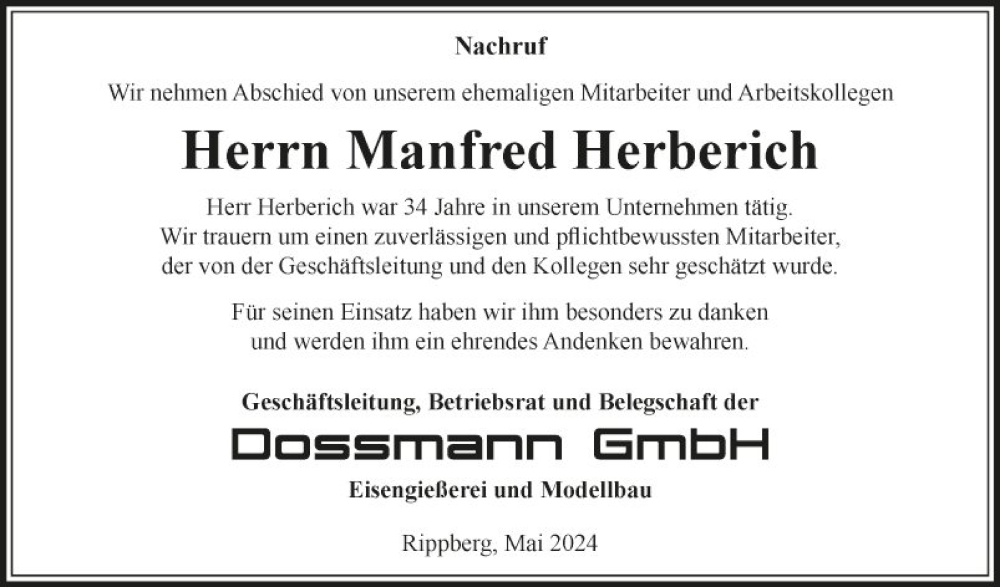 Hier finden Sie alle Traueranzeigen aus der Zeitung, die bisher für Manfred Herberich erschienen sind. Weitere Traueranzeigen, die in der Zeitung erscheinen, werden hier ebenfalls aufgelistet