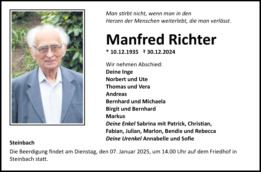 Hier finden Sie alle Traueranzeigen aus der Zeitung, die bisher für Manfred Richter erschienen sind. Weitere Traueranzeigen, die in der Zeitung erscheinen, werden hier ebenfalls aufgelistet
