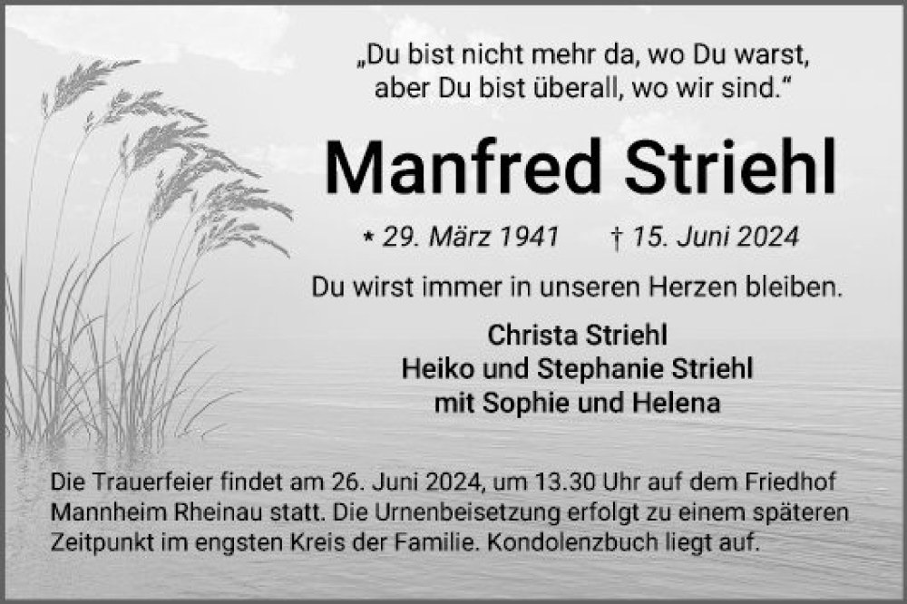 Hier finden Sie alle Traueranzeigen aus der Zeitung, die bisher für Manfred Striehl erschienen sind. Weitere Traueranzeigen, die in der Zeitung erscheinen, werden hier ebenfalls aufgelistet