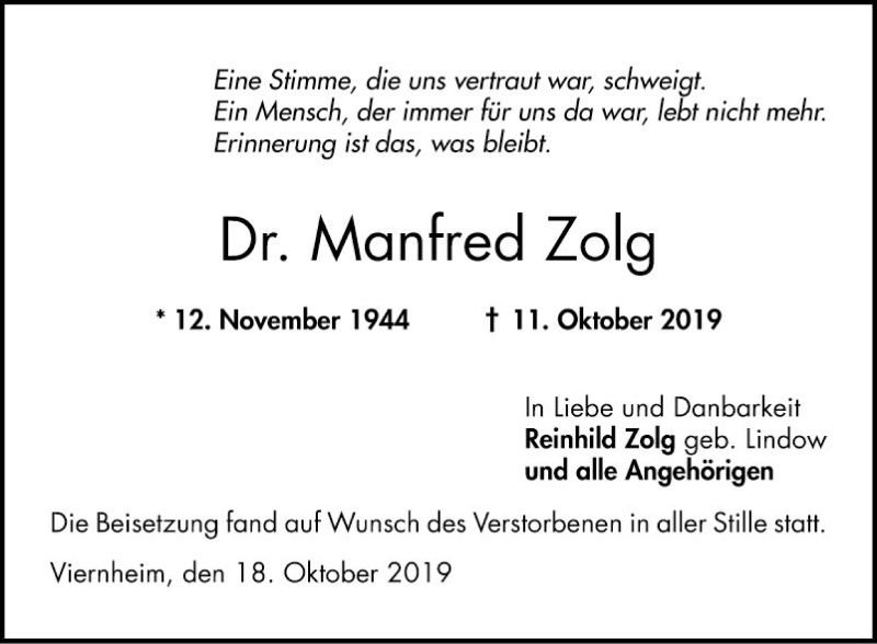 Hier finden Sie alle Traueranzeigen aus der Zeitung, die bisher für Manfred Zolg erschienen sind. Weitere Traueranzeigen, die in der Zeitung erscheinen, werden hier ebenfalls aufgelistet
