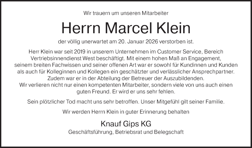 Hier finden Sie alle Traueranzeigen aus der Zeitung, die bisher für Marcel Klein erschienen sind. Weitere Traueranzeigen, die in der Zeitung erscheinen, werden hier ebenfalls aufgelistet