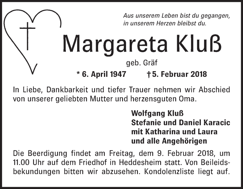 Hier finden Sie alle Traueranzeigen aus der Zeitung, die bisher für Margareta Kluß erschienen sind. Weitere Traueranzeigen, die in der Zeitung erscheinen, werden hier ebenfalls aufgelistet