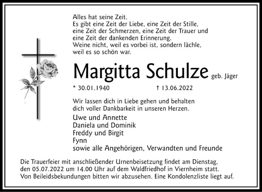 Hier finden Sie alle Traueranzeigen aus der Zeitung, die bisher für Margitta Schulze erschienen sind. Weitere Traueranzeigen, die in der Zeitung erscheinen, werden hier ebenfalls aufgelistet
