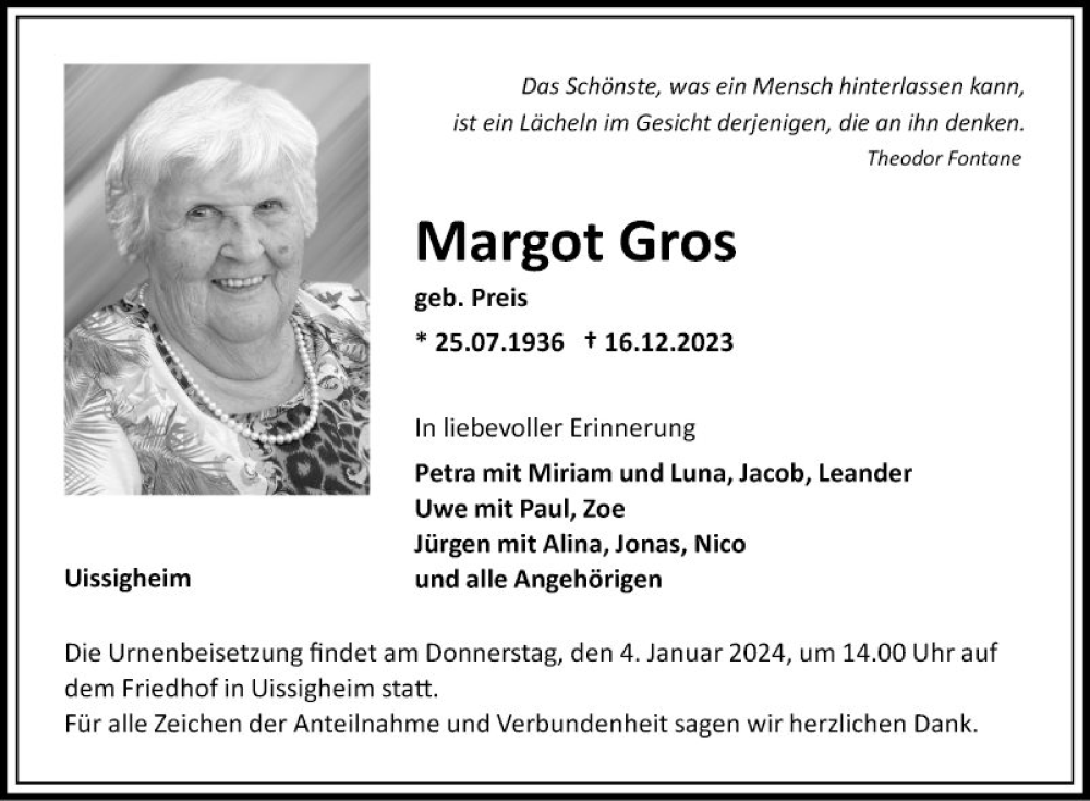 Hier finden Sie alle Traueranzeigen aus der Zeitung, die bisher für Margot Gros erschienen sind. Weitere Traueranzeigen, die in der Zeitung erscheinen, werden hier ebenfalls aufgelistet