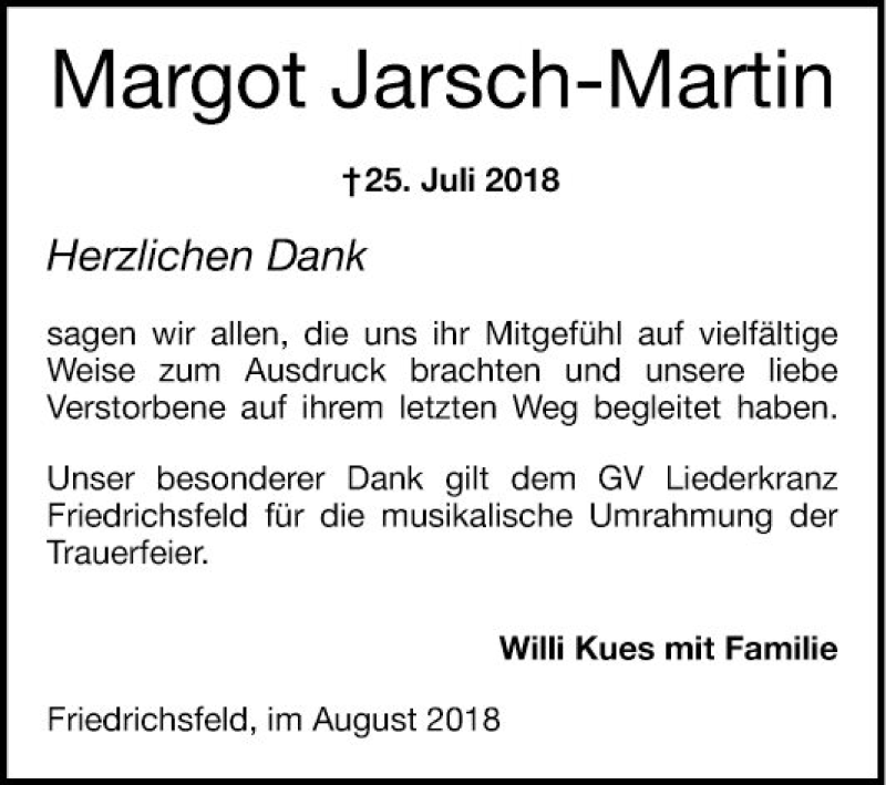 Hier finden Sie alle Traueranzeigen aus der Zeitung, die bisher für Margot Jarsch-Martin erschienen sind. Weitere Traueranzeigen, die in der Zeitung erscheinen, werden hier ebenfalls aufgelistet