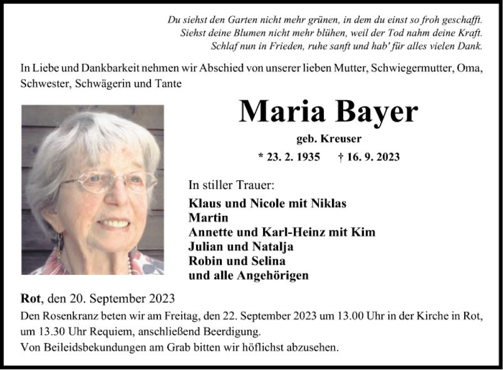 Hier finden Sie alle Traueranzeigen aus der Zeitung, die bisher für Maria Bayer erschienen sind. Weitere Traueranzeigen, die in der Zeitung erscheinen, werden hier ebenfalls aufgelistet