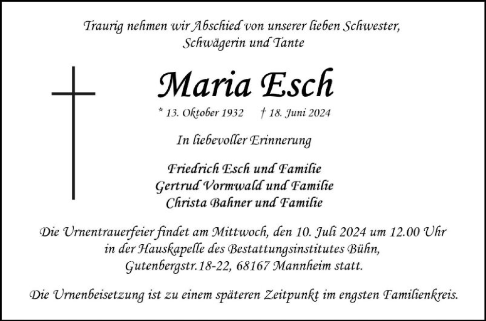 Hier finden Sie alle Traueranzeigen aus der Zeitung, die bisher für Maria Esch erschienen sind. Weitere Traueranzeigen, die in der Zeitung erscheinen, werden hier ebenfalls aufgelistet
