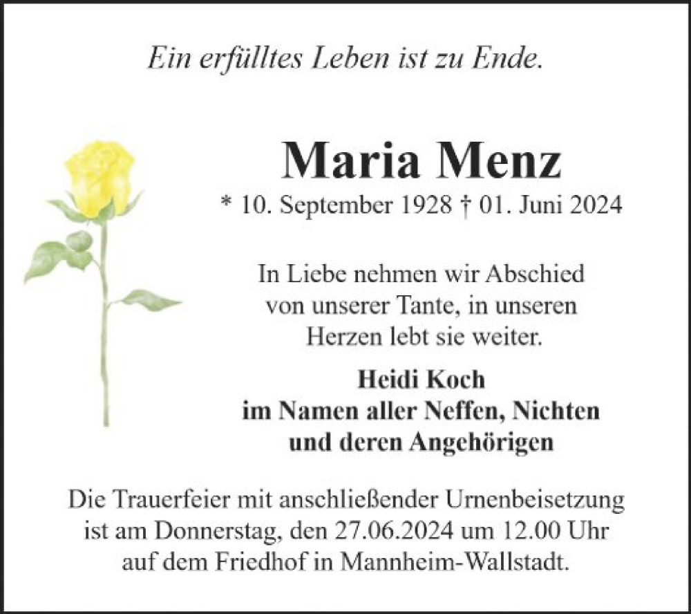 Hier finden Sie alle Traueranzeigen aus der Zeitung, die bisher für Maria Menz erschienen sind. Weitere Traueranzeigen, die in der Zeitung erscheinen, werden hier ebenfalls aufgelistet