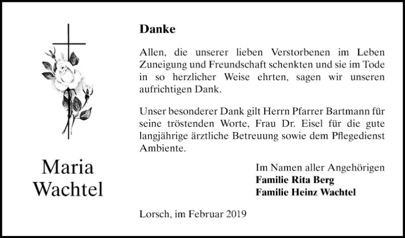 Hier finden Sie alle Traueranzeigen aus der Zeitung, die bisher für Maria Wachtel erschienen sind. Weitere Traueranzeigen, die in der Zeitung erscheinen, werden hier ebenfalls aufgelistet