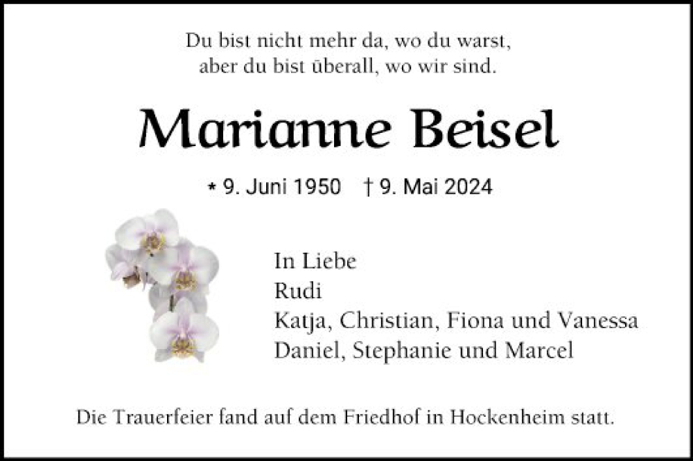 Hier finden Sie alle Traueranzeigen aus der Zeitung, die bisher für Marianne Beisel erschienen sind. Weitere Traueranzeigen, die in der Zeitung erscheinen, werden hier ebenfalls aufgelistet