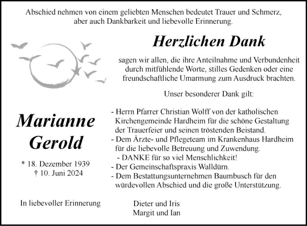 Hier finden Sie alle Traueranzeigen aus der Zeitung, die bisher für Marianne Gerold erschienen sind. Weitere Traueranzeigen, die in der Zeitung erscheinen, werden hier ebenfalls aufgelistet