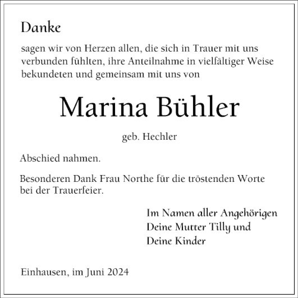 Hier finden Sie alle Traueranzeigen aus der Zeitung, die bisher für Marina Bühler erschienen sind. Weitere Traueranzeigen, die in der Zeitung erscheinen, werden hier ebenfalls aufgelistet