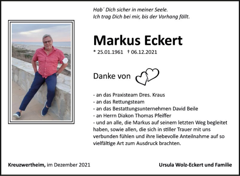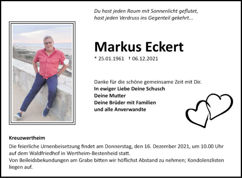 Hier finden Sie alle Traueranzeigen aus der Zeitung, die bisher für Markus Eckert erschienen sind. Weitere Traueranzeigen, die in der Zeitung erscheinen, werden hier ebenfalls aufgelistet