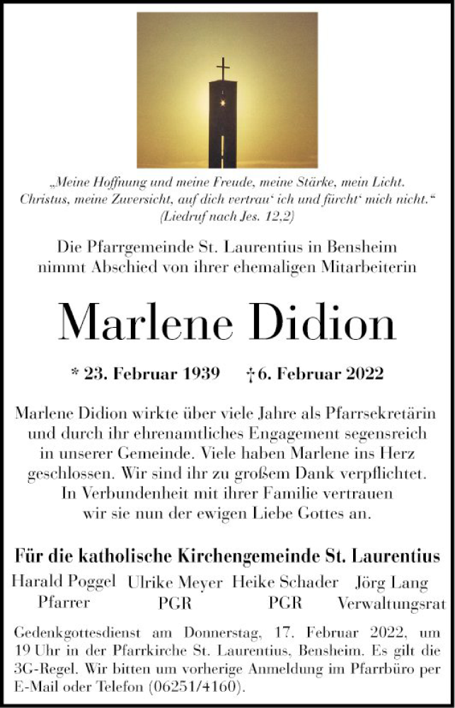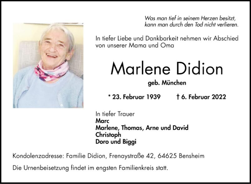 Hier finden Sie alle Traueranzeigen aus der Zeitung, die bisher für Marlene Didion erschienen sind. Weitere Traueranzeigen, die in der Zeitung erscheinen, werden hier ebenfalls aufgelistet