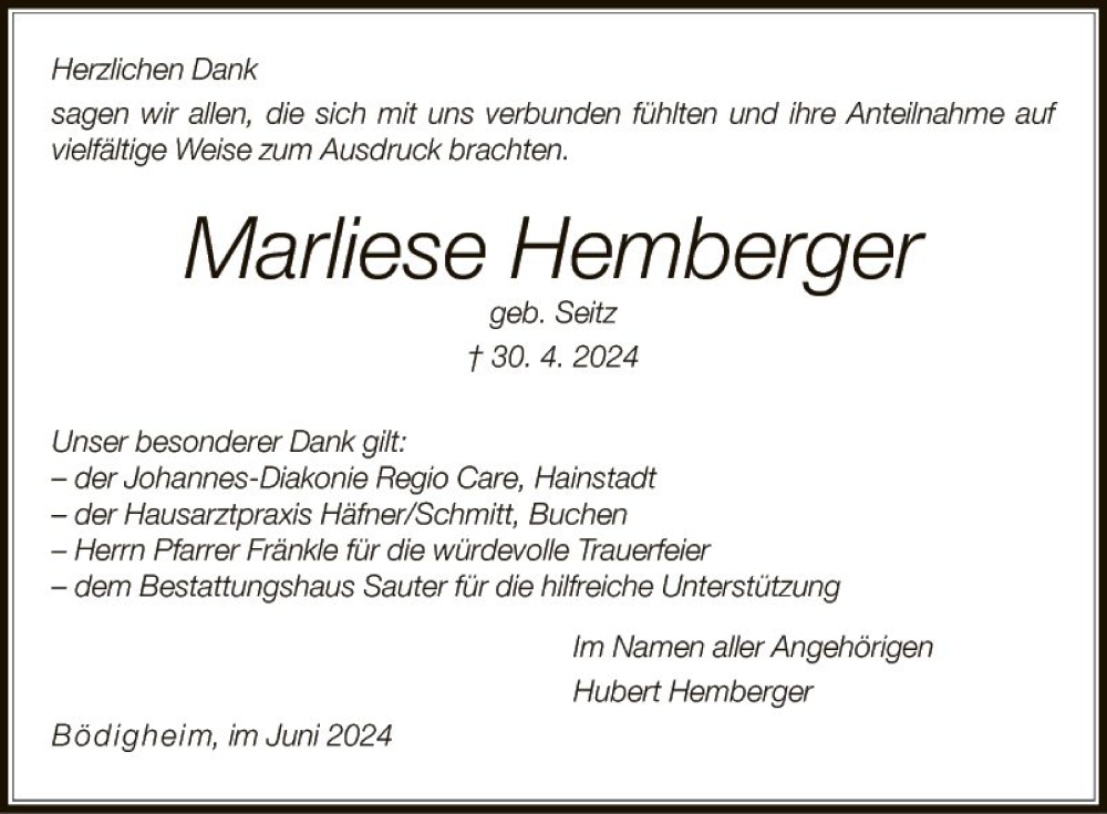Hier finden Sie alle Traueranzeigen aus der Zeitung, die bisher für Marliese Hemberger erschienen sind. Weitere Traueranzeigen, die in der Zeitung erscheinen, werden hier ebenfalls aufgelistet