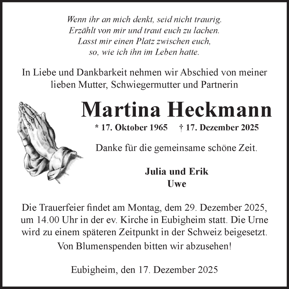 Hier finden Sie alle Traueranzeigen aus der Zeitung, die bisher für Martina Heckmann erschienen sind. Weitere Traueranzeigen, die in der Zeitung erscheinen, werden hier ebenfalls aufgelistet