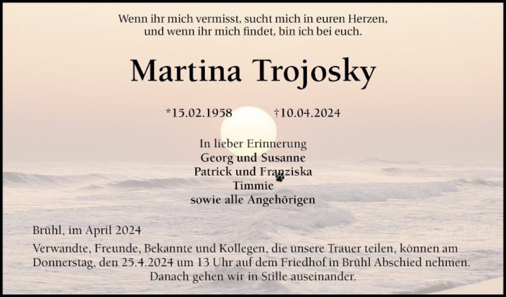 Hier finden Sie alle Traueranzeigen aus der Zeitung, die bisher für Martina Trojosky erschienen sind. Weitere Traueranzeigen, die in der Zeitung erscheinen, werden hier ebenfalls aufgelistet