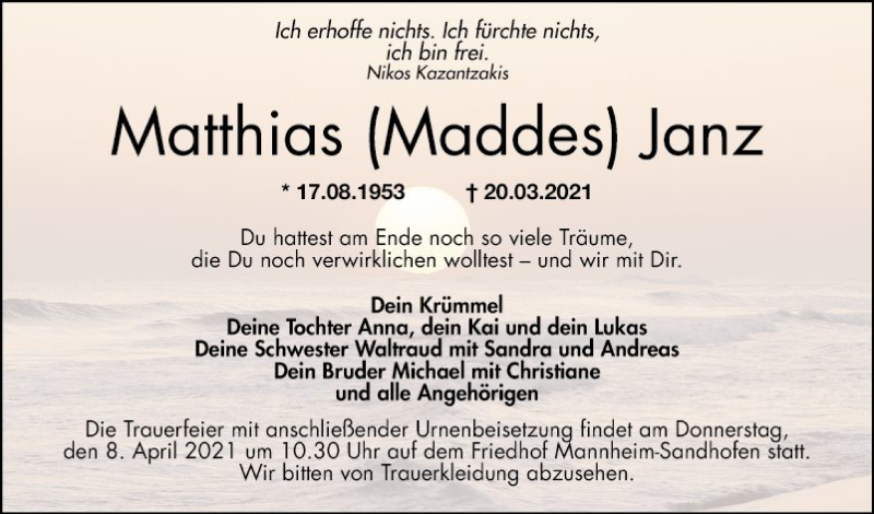 Hier finden Sie alle Traueranzeigen aus der Zeitung, die bisher für Matthias Janz erschienen sind. Weitere Traueranzeigen, die in der Zeitung erscheinen, werden hier ebenfalls aufgelistet