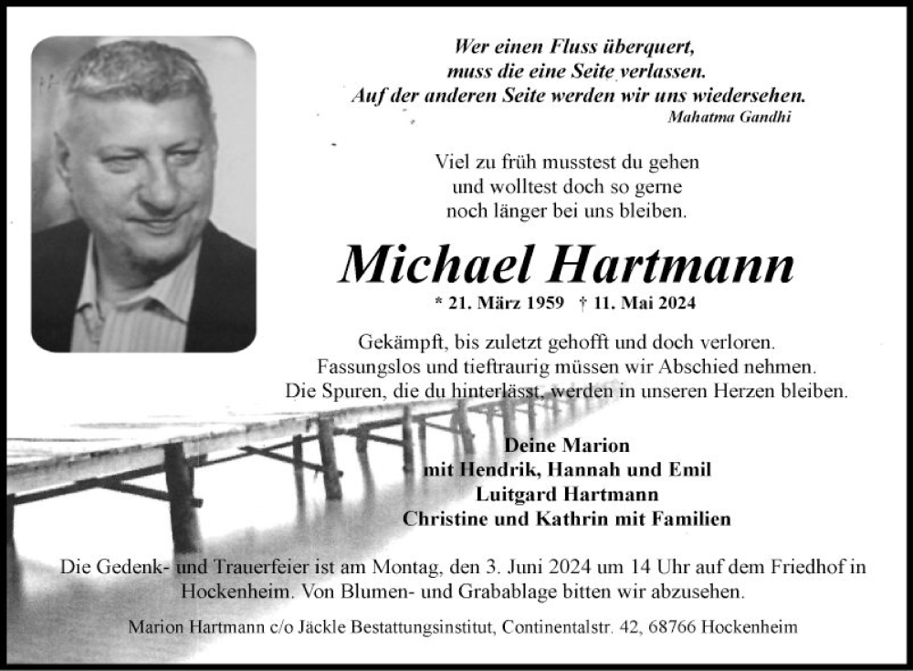 Hier finden Sie alle Traueranzeigen aus der Zeitung, die bisher für Michael Hartmann erschienen sind. Weitere Traueranzeigen, die in der Zeitung erscheinen, werden hier ebenfalls aufgelistet