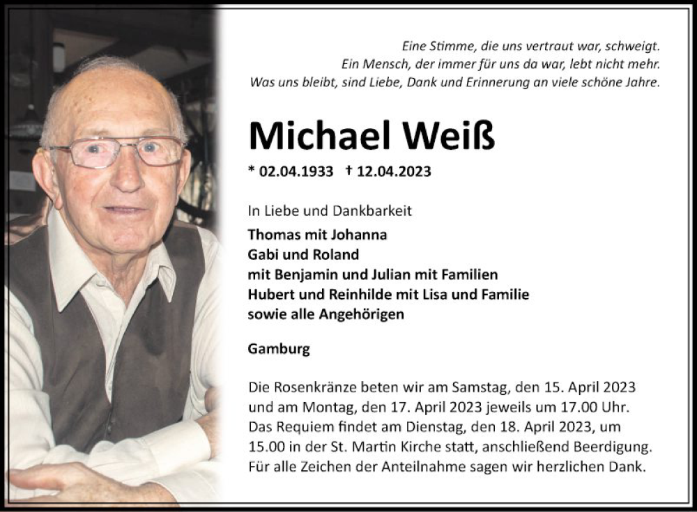Hier finden Sie alle Traueranzeigen aus der Zeitung, die bisher für Michael Weiß erschienen sind. Weitere Traueranzeigen, die in der Zeitung erscheinen, werden hier ebenfalls aufgelistet