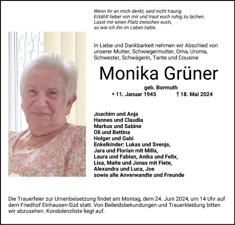 Hier finden Sie alle Traueranzeigen aus der Zeitung, die bisher für Monika Grüner erschienen sind. Weitere Traueranzeigen, die in der Zeitung erscheinen, werden hier ebenfalls aufgelistet