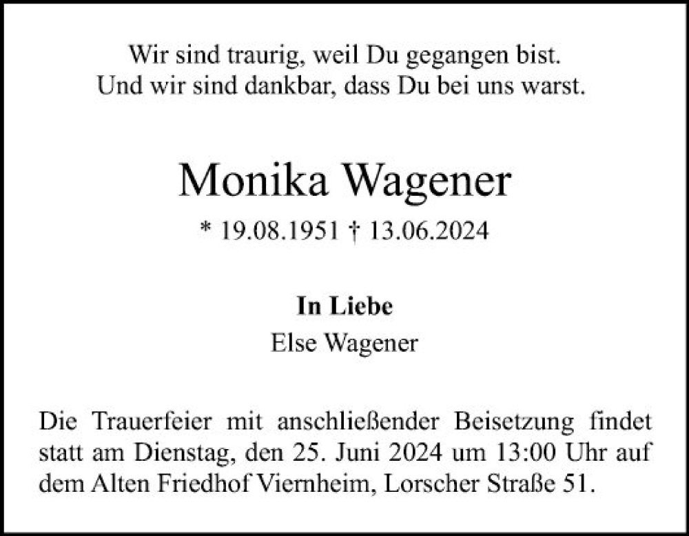 Hier finden Sie alle Traueranzeigen aus der Zeitung, die bisher für Monika Wagener erschienen sind. Weitere Traueranzeigen, die in der Zeitung erscheinen, werden hier ebenfalls aufgelistet