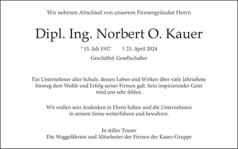 Hier finden Sie alle Traueranzeigen aus der Zeitung, die bisher für Norbert O. Kauer erschienen sind. Weitere Traueranzeigen, die in der Zeitung erscheinen, werden hier ebenfalls aufgelistet