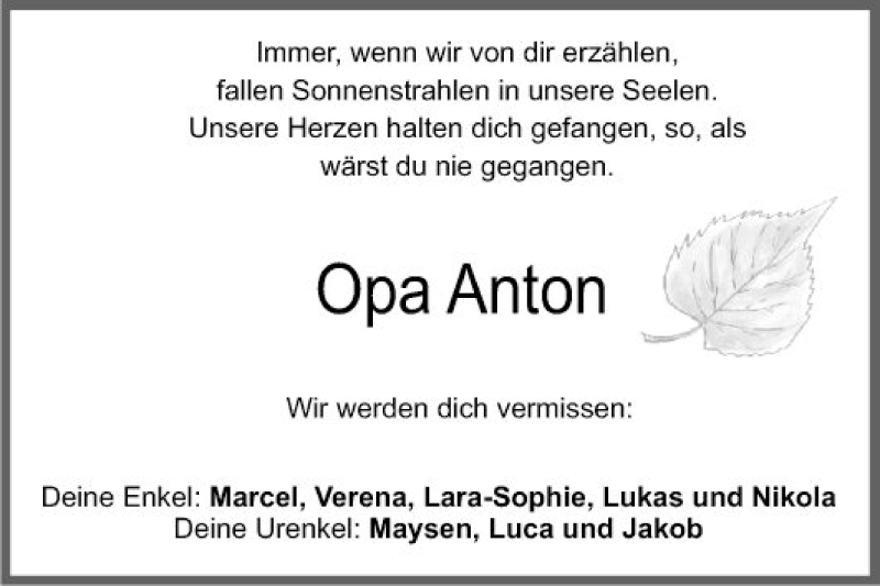 Hier finden Sie alle Traueranzeigen aus der Zeitung, die bisher für Opa Anton erschienen sind. Weitere Traueranzeigen, die in der Zeitung erscheinen, werden hier ebenfalls aufgelistet