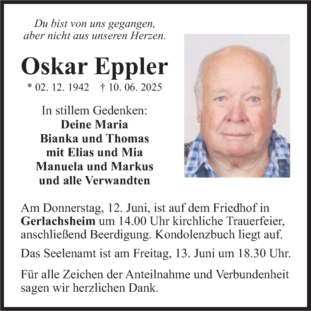 Hier finden Sie alle Traueranzeigen aus der Zeitung, die bisher für Oskar Eppler erschienen sind. Weitere Traueranzeigen, die in der Zeitung erscheinen, werden hier ebenfalls aufgelistet