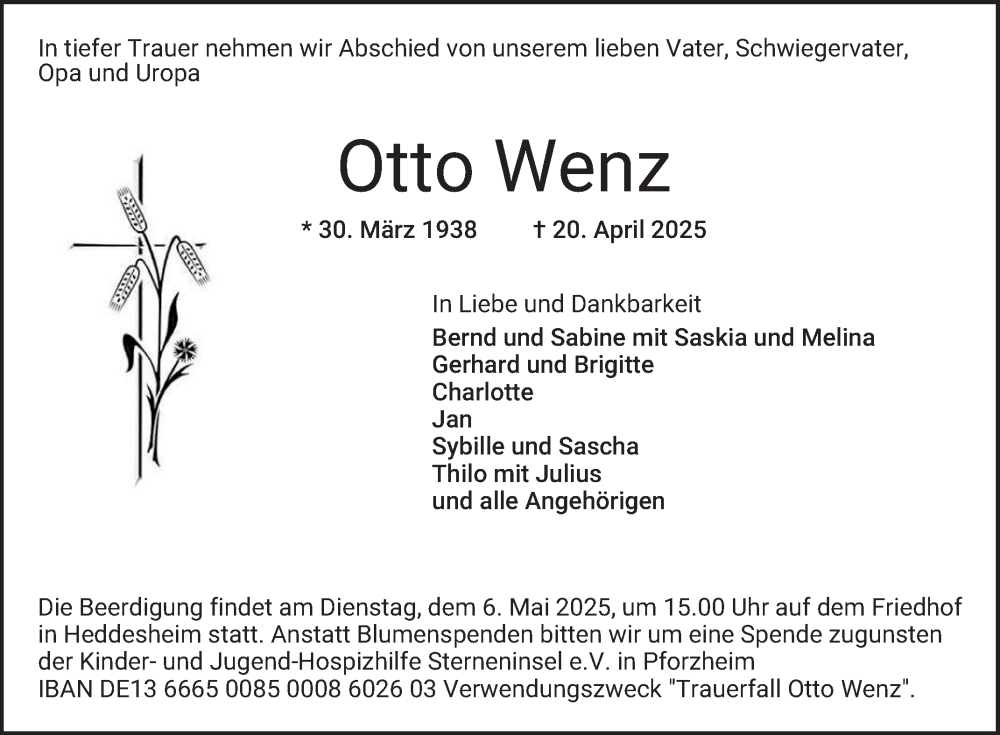 Hier finden Sie alle Traueranzeigen aus der Zeitung, die bisher für Otto Wenz erschienen sind. Weitere Traueranzeigen, die in der Zeitung erscheinen, werden hier ebenfalls aufgelistet
