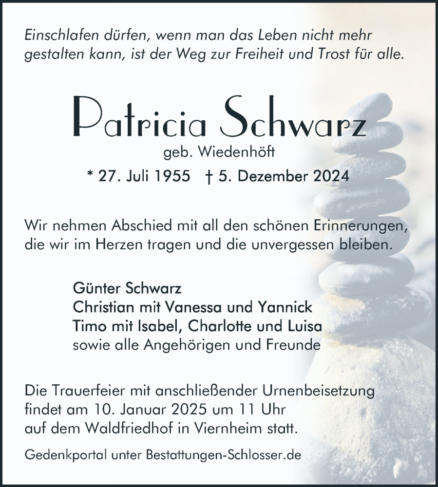 Hier finden Sie alle Traueranzeigen aus der Zeitung, die bisher für Patricia Schwarz erschienen sind. Weitere Traueranzeigen, die in der Zeitung erscheinen, werden hier ebenfalls aufgelistet