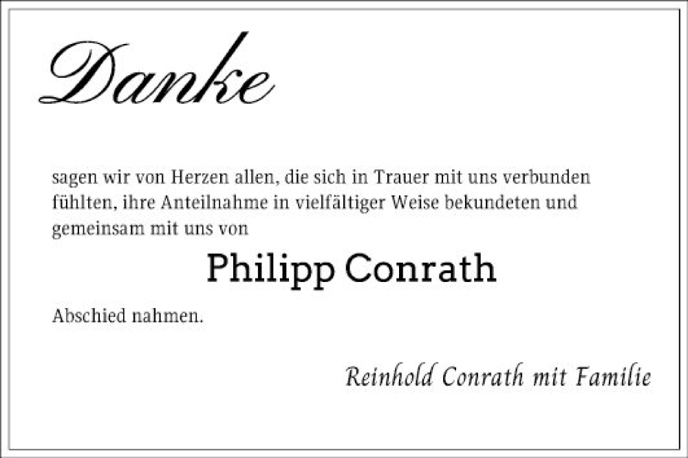 Hier finden Sie alle Traueranzeigen aus der Zeitung, die bisher für Philipp Conrath erschienen sind. Weitere Traueranzeigen, die in der Zeitung erscheinen, werden hier ebenfalls aufgelistet