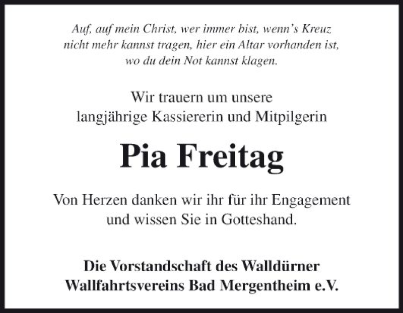Hier finden Sie alle Traueranzeigen aus der Zeitung, die bisher für Pia Freitag erschienen sind. Weitere Traueranzeigen, die in der Zeitung erscheinen, werden hier ebenfalls aufgelistet