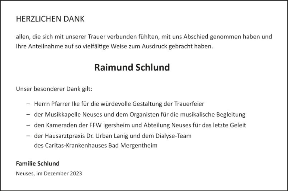 Hier finden Sie alle Traueranzeigen aus der Zeitung, die bisher für Raimund Schlund erschienen sind. Weitere Traueranzeigen, die in der Zeitung erscheinen, werden hier ebenfalls aufgelistet
