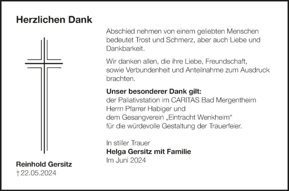 Hier finden Sie alle Traueranzeigen aus der Zeitung, die bisher für Reinhold Gersitz erschienen sind. Weitere Traueranzeigen, die in der Zeitung erscheinen, werden hier ebenfalls aufgelistet