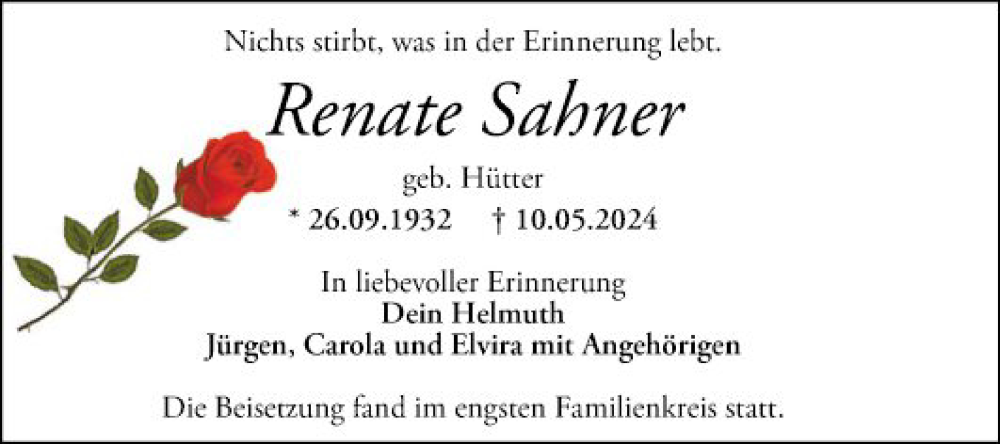 Hier finden Sie alle Traueranzeigen aus der Zeitung, die bisher für Renate Sahner erschienen sind. Weitere Traueranzeigen, die in der Zeitung erscheinen, werden hier ebenfalls aufgelistet