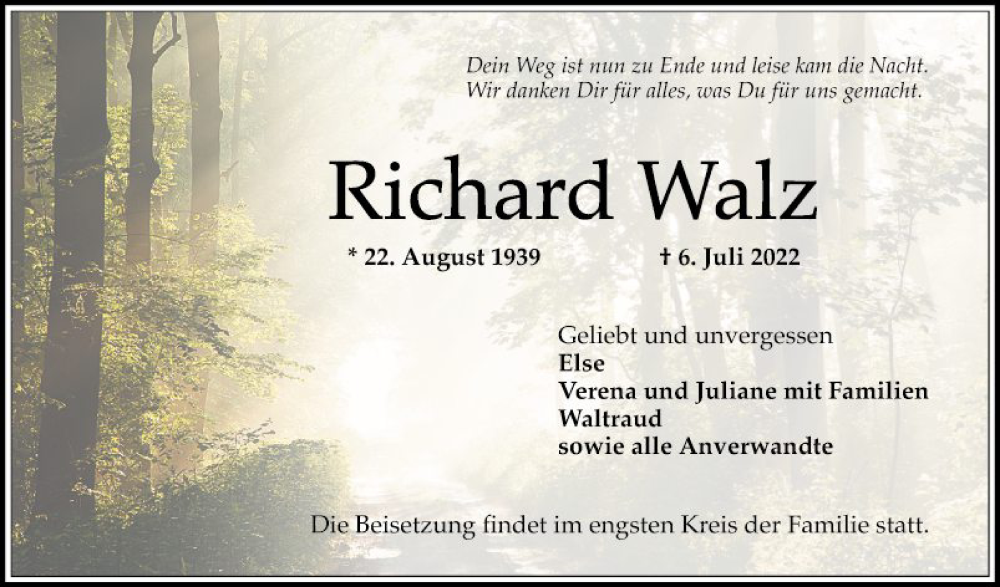 Hier finden Sie alle Traueranzeigen aus der Zeitung, die bisher für Richard Walz erschienen sind. Weitere Traueranzeigen, die in der Zeitung erscheinen, werden hier ebenfalls aufgelistet