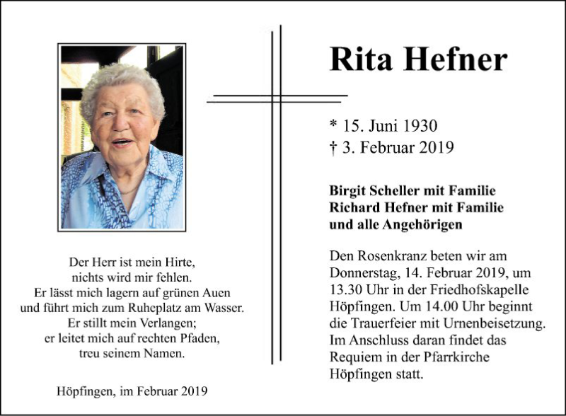 Hier finden Sie alle Traueranzeigen aus der Zeitung, die bisher für Rita Hefner erschienen sind. Weitere Traueranzeigen, die in der Zeitung erscheinen, werden hier ebenfalls aufgelistet